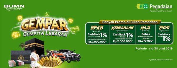 | Dear Sahabat, Promo Gempar (Gempita Lebaran) dari Pegadaian masih berlangsung hingga 30 Juni 2019. Jadi, jangan lewatkan kesempatan untuk mendapatkan mendapatkan keuntungan berupa bebas biaya admin hingga cashback senilai Rp 2.000.000*. Promo Gempar meliputi beragam produk mulai dari Gempar BPKB, Gempar Haji, Gempar Emas, hingga Gempar Kendaraan. Untuk info selengkapnya, Anda bisa mengunjungi halaman berikut ini: |